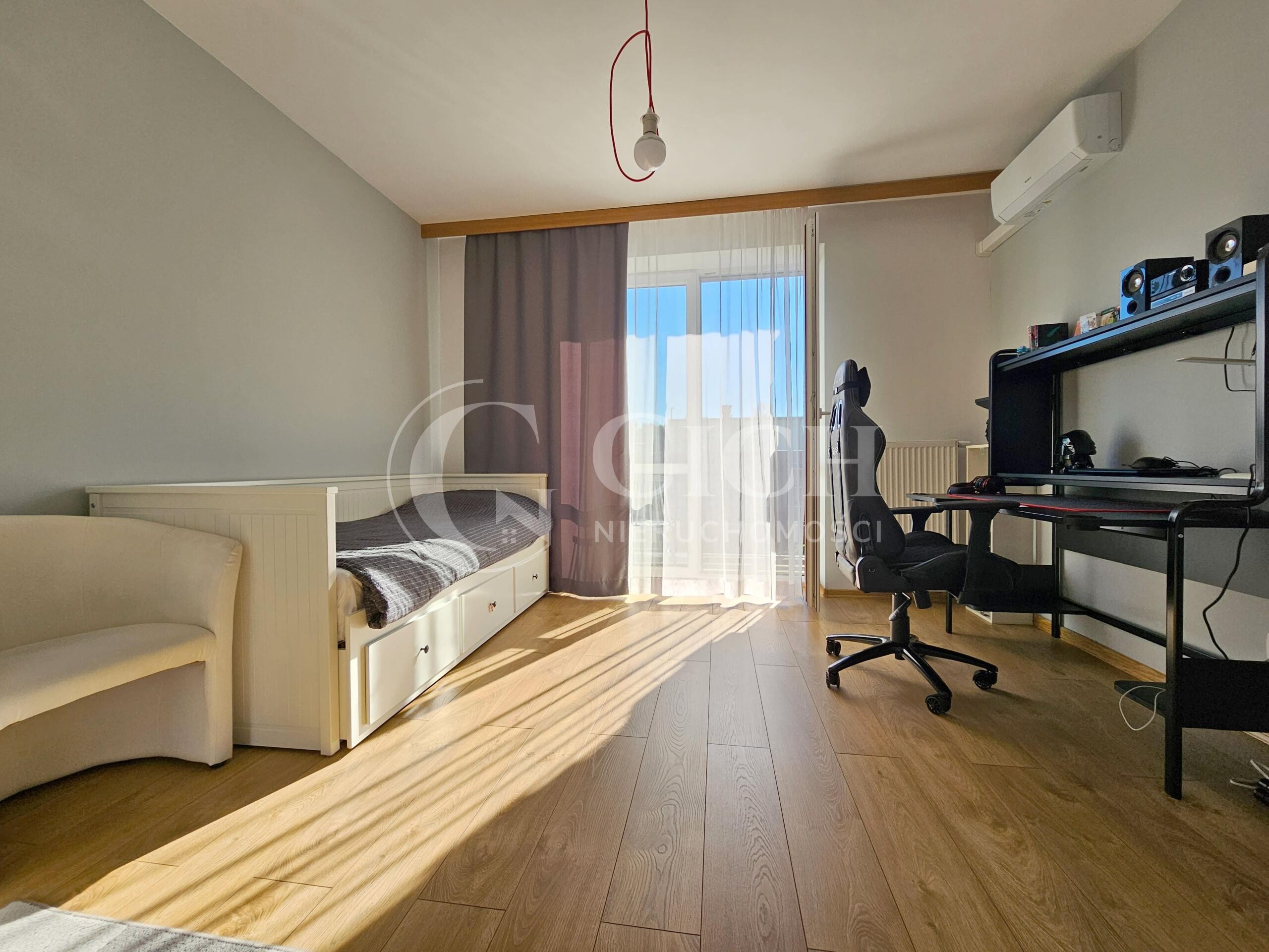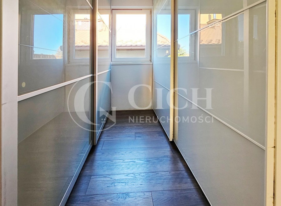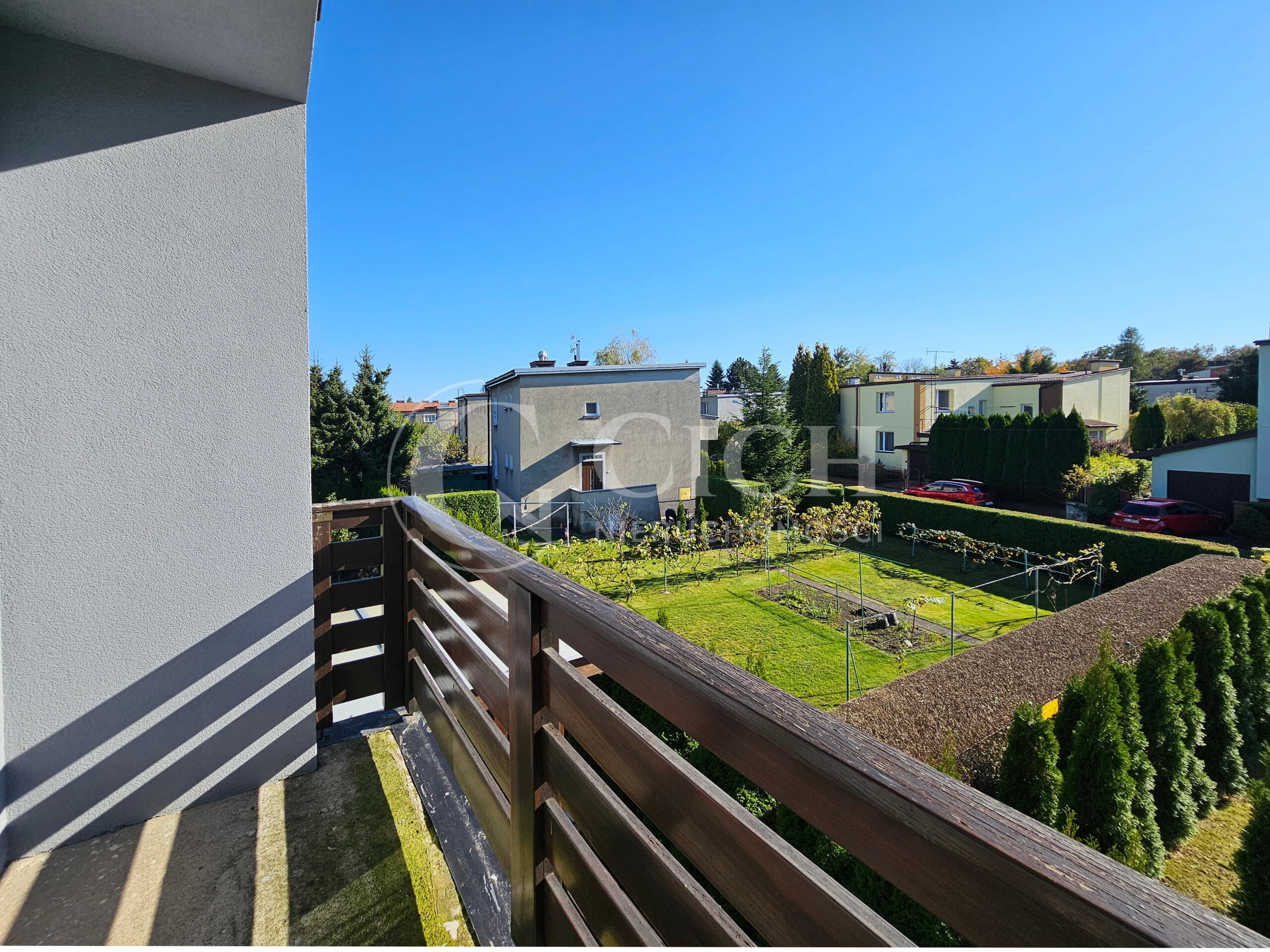 Na półpiętrze znajdujemy zamkniętą strefę dla rodziców, składającą się z sypialni, garderoby oraz pomieszczenia przewidzianego na łazienkę. Dodatkowym atutem tej strefy jest wyjście na balkon, które umożliwia podziwianie ogrodu.