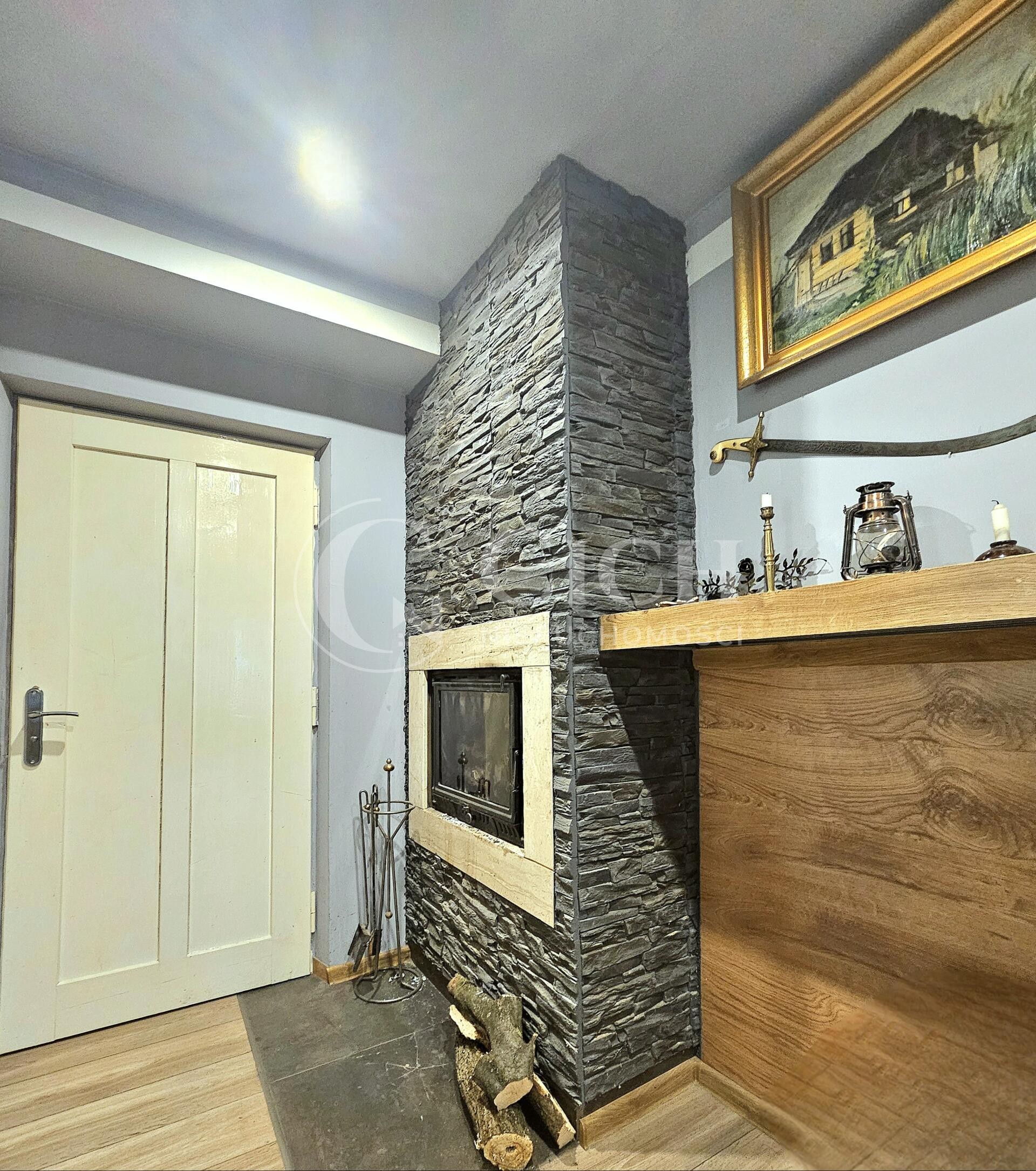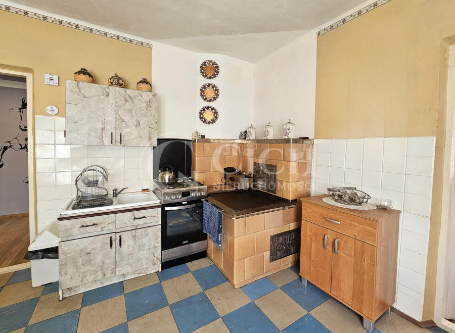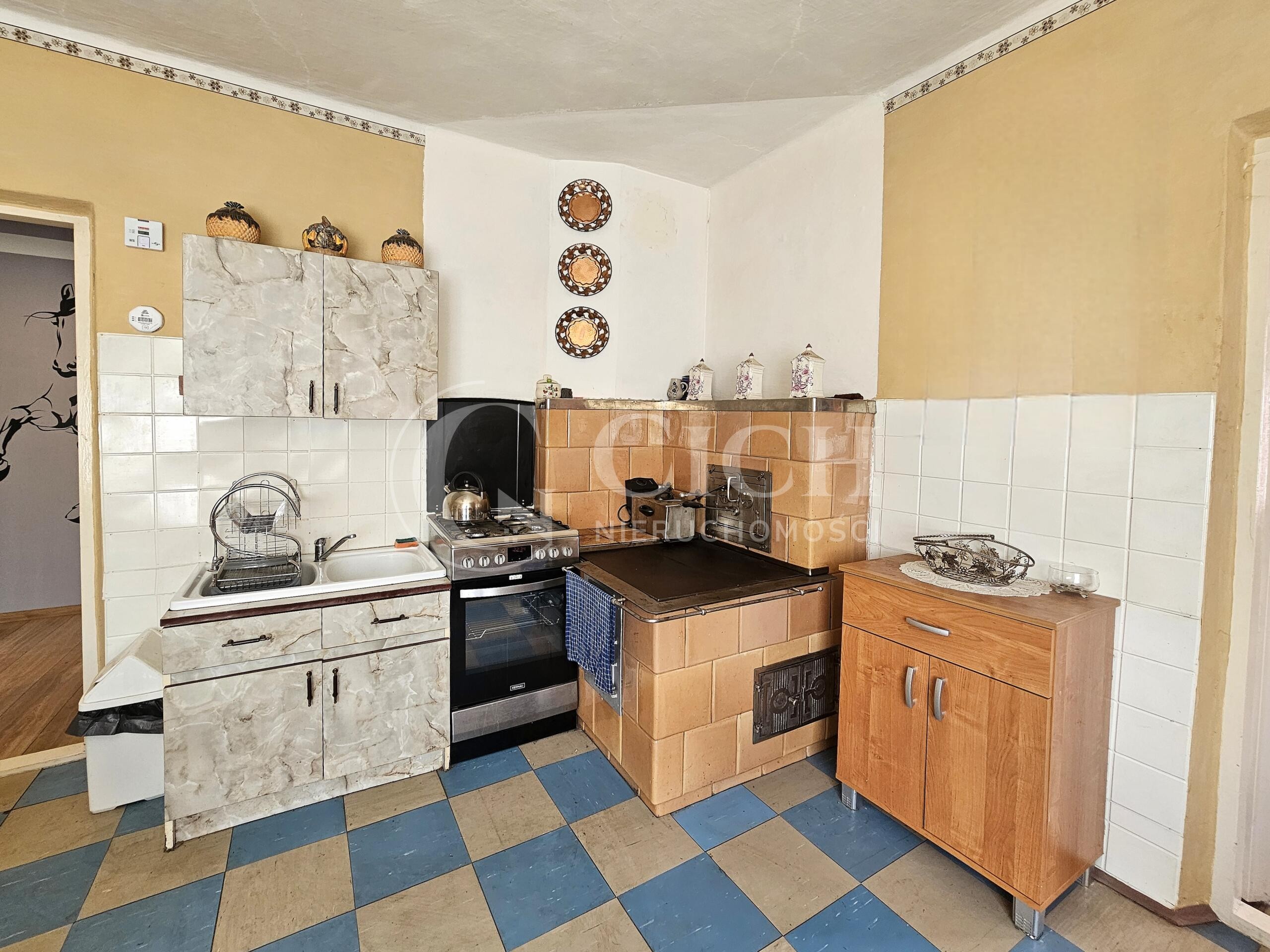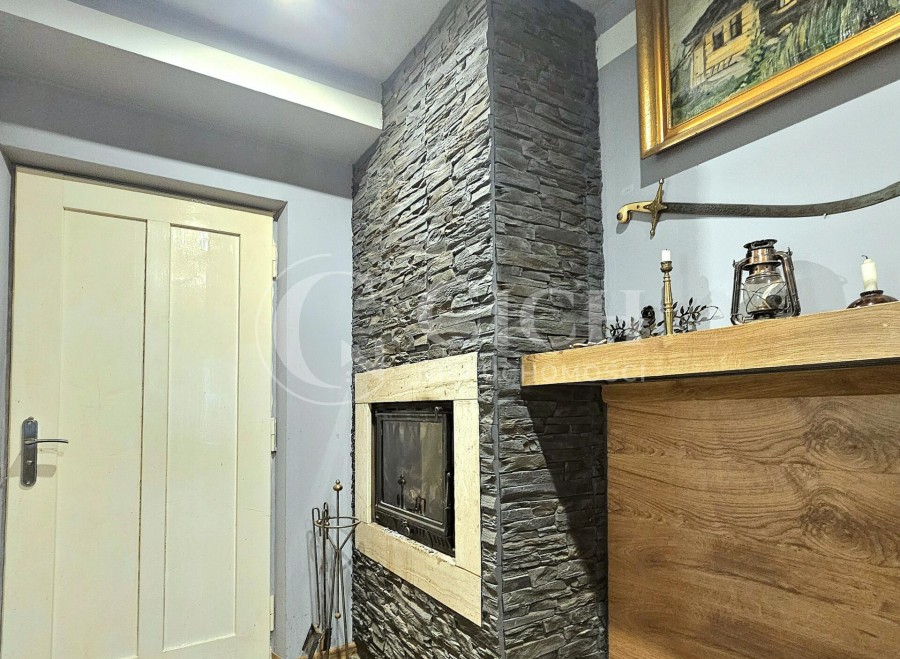 Ogrzewanie domu zapewnia kominek z płaszczem powietrznym, który rozprowadza ciepło do wszystkich pomieszczeń, a także działający piec kaflowy, co tworzy przytulną atmosferę w zimowe wieczory.