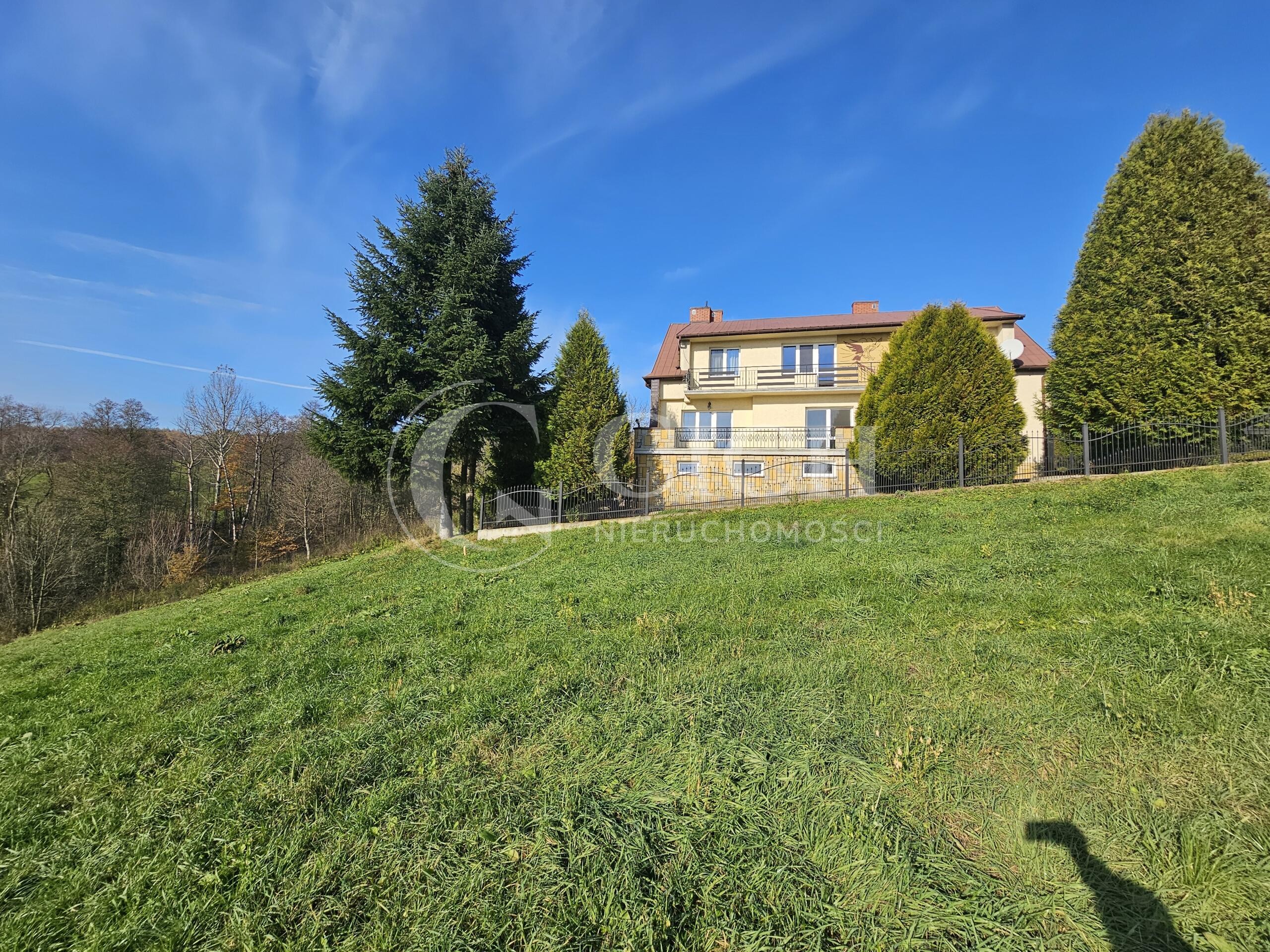 Zarówno z działki jak i obszernego tarasu i balkonu rozciąga się widok na pobliskie górki.